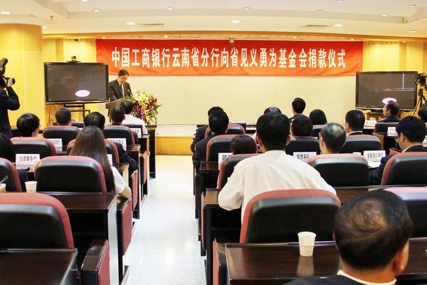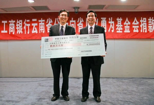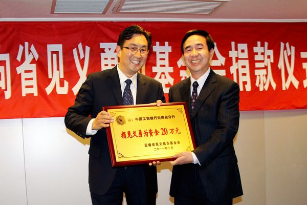 10月11日,中国工商银行云南省分行在昆明举行捐赠仪式,向我会捐款20万元。该行始终把回报社会,为建设和谐社会做出贡献作为大型国有商业银行的应有责任。希望通过此次行动,倡导见义勇为,弘扬社会正气,让英雄的精神折射时代风采,让彩云之南更加平安和谐。