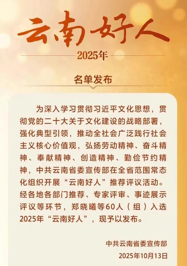 经各地各部门推荐、专家评审、事迹展示评议等环节,中共云南省委宣传部发布2025年“云南好人”名单,共60人(组)入选。其中,12人(组)见义勇为人员入选2025年“云南好人”。