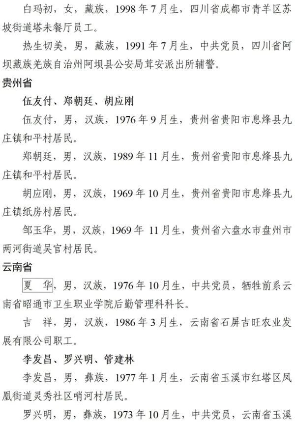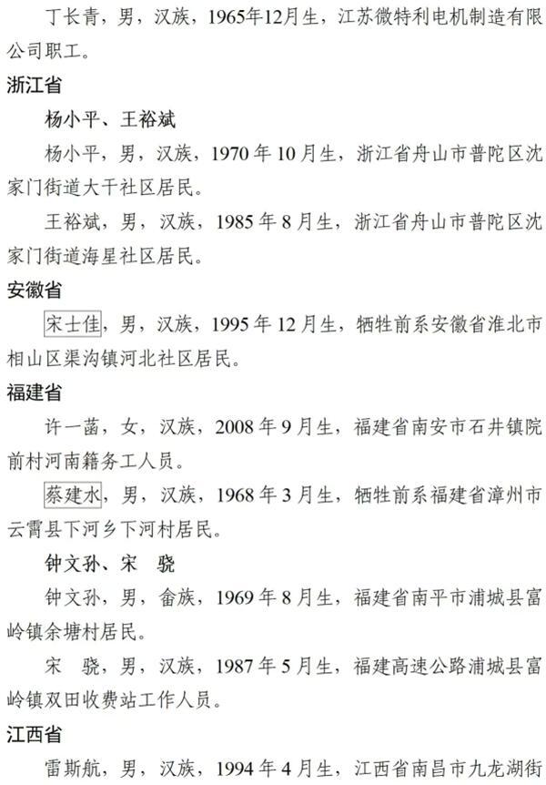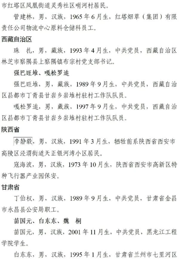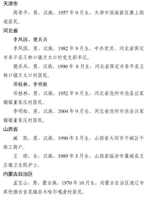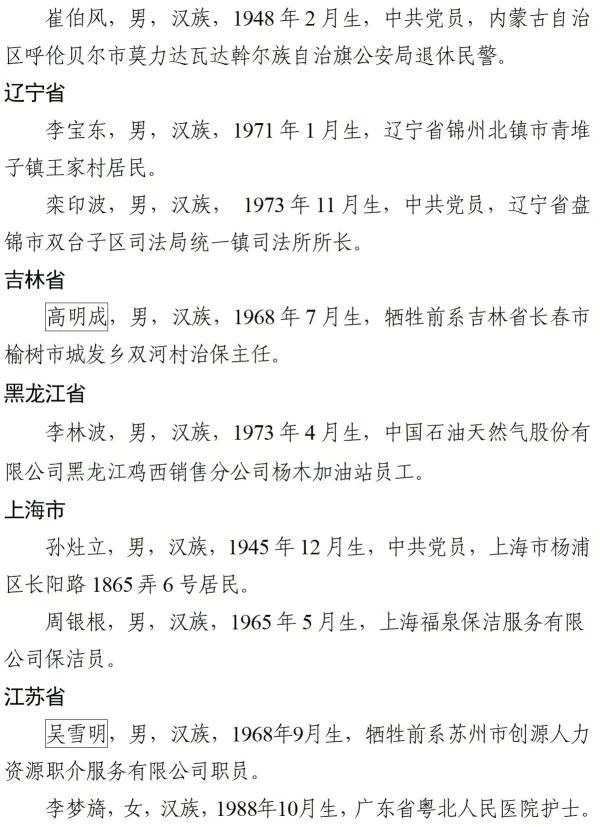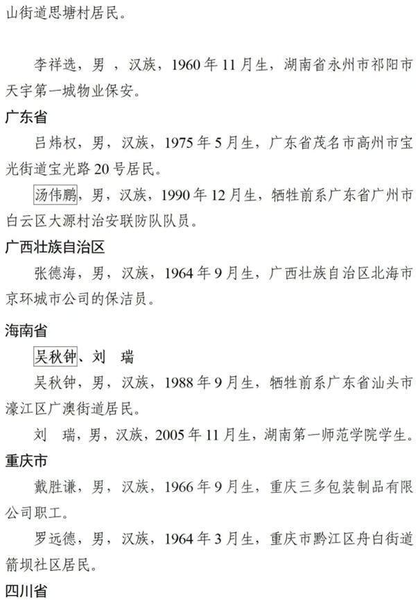 上榜的见义勇为勇士,有在汛期暴雨洪水中向险而行、抢险救出多人的李风国、樊兵兵、汤伟鹏、朱旭阳等;有在犯罪嫌疑人持刀行凶时挺身而出、英勇搏斗的崔伯风、高明成、许一菡、陈文彬、邹玉华等;有在深达40米低温缺氧井中救出幼童的女辅警布帕太姆·阿布杜喀迪尔;有第27批援坦桑尼亚中国医疗队队长张军桥为施救当地民众英勇牺牲,用生命践行中非人民友好精神。此次榜单中,吴雪明、宋士佳、蔡建水、吴秋钟、夏华、李静毅等11位勇士为保护他人生命财产安全献出了宝贵生命,让我们向他们致以崇高敬意!