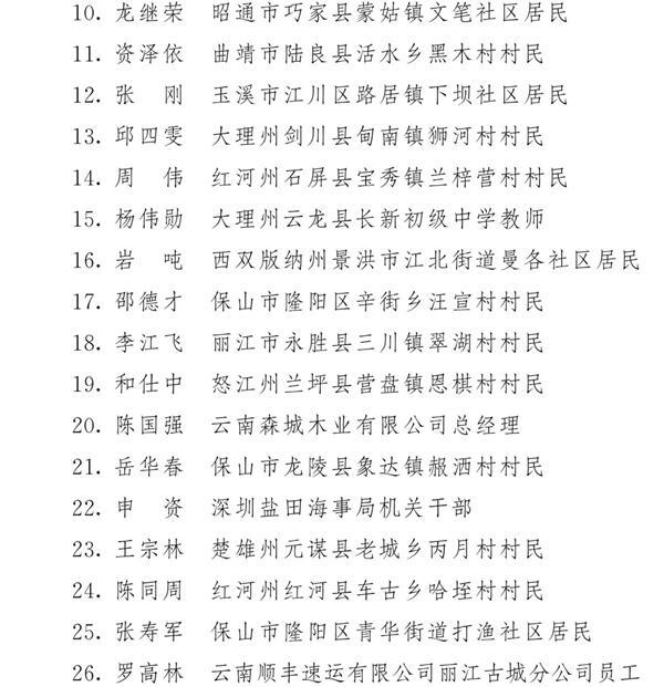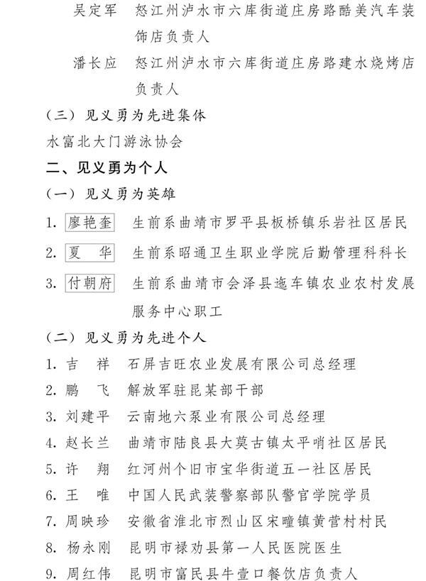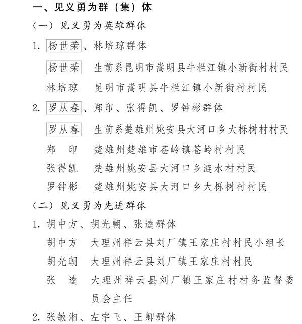 为大力弘扬社会主义核心价值观,让全社会充满正气正义,建设人人有责、人人尽责、人人享有的社会治理共同体,按照《云南省奖励和保护见义勇为人员条例》规定,省人民政府决定,授予杨世荣、林培琼等2个群体“云南省见义勇为英雄群体”称号;授予胡中方、胡光朝、张逵等11个群体“云南省见义勇为先进群体”称号;授予水富北大门游泳协会1个集体“云南省见义勇为先进集体”称号;授予廖艳奎等3名个人“云南省见义勇为英雄”称号;授予吉祥等26名个人“云南省见义勇为先进个人”称号。